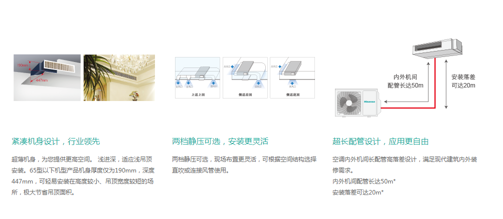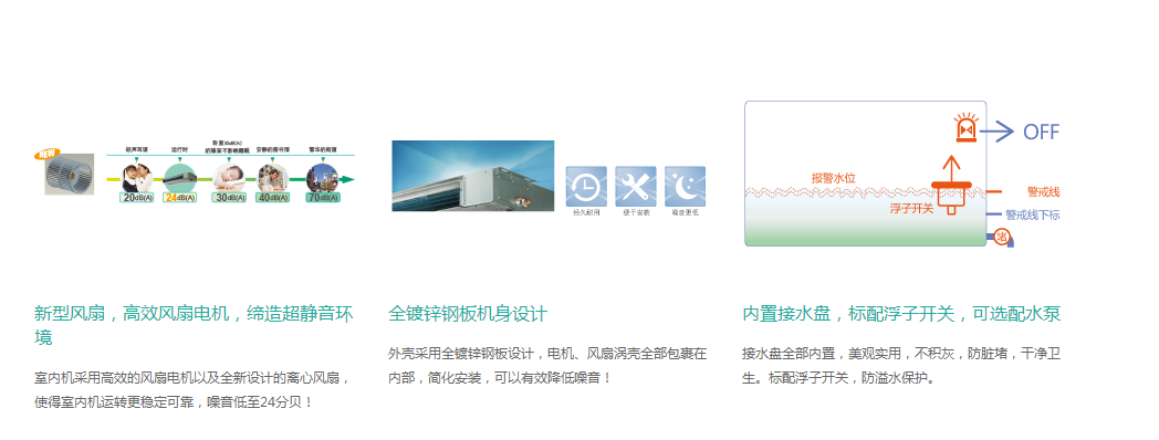 緊湊型機身設計,行業領先者兩種靜壓可選,安裝更靈活新型風扇,高效風扇電機,創造超靜音環境GB/T1497-1989室內機組全鍍鋅鋼板機身設計內置水接線板,標準浮子開關,以消除潛在的泄漏危險超長管道設計,更自由的應用
