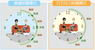 日立頂層壓力除霜模式(PTT除霜模式),以160型為例,采用室外單位溫度傳感器、換熱器溫度傳感器和壓力傳感器,采用可變參數(shù)除霜,準(zhǔn)確掌握除霜時(shí)間,單位時(shí)間結(jié)霜量明顯減少,僅為常規(guī)除霜方式的1/3,減少了結(jié)霜次數(shù),保證了冬季取暖效果。