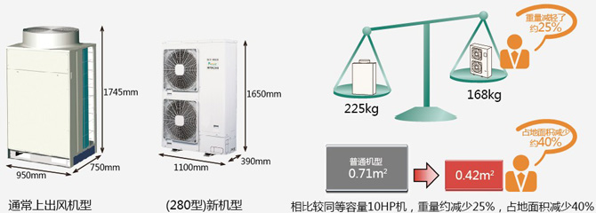 室外機組采用側(cè)出口空氣小型化、輕量化設(shè)計,型號尺寸為1650(H)×1100(W)×390(D),與同容量的普通產(chǎn)品相比,大大減少了占用面積和重量。